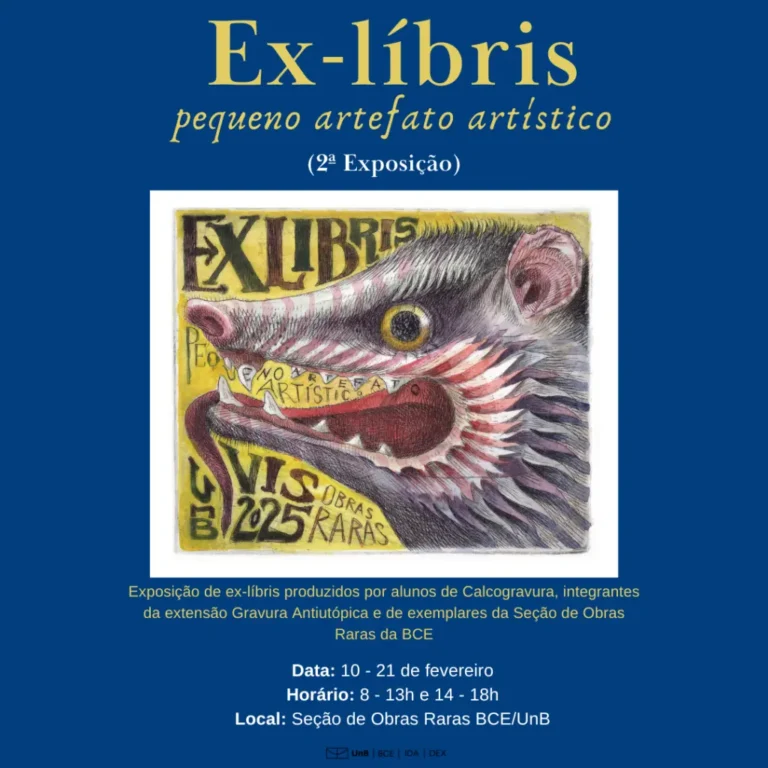 2ª Exposição Ex-líbris: pequeno artefato artístico Data: 10 a 21 de fevereiro de 2025 Horário: 8h às 13h e 14h às 18h Local: Obras Raras BCE/UnB Venha conferir a 2ª exposição de ex-líbris, realizados por alunos da disciplina de Calcogravura, de integrantes do…