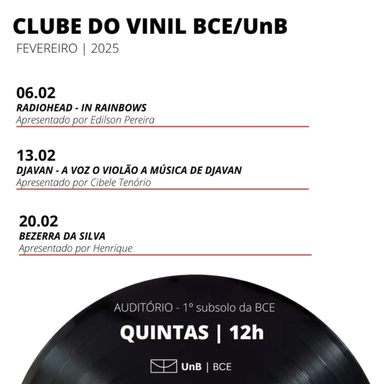 Local : Auditório da BCE, 1º subsolo 06.02, quinta-feira , 12h In Rainbows, Radiohead Apresentação por Edilson Pereira , mediação por Marcelo Scarabuci 13.02 , quinta-feira , 12hA voz o violão a música de Djavan Apresentação por Cibele Tenório 20.02 , quinta-feira ,…