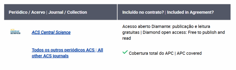 Na página “CAPES consortium Brazil“, vá até o conteúdo “Quais periódicos da ACS estão incluídos neste contrato? | Which ACS journals are included in this agreement?” e verifique quais títulos estão cobertos pelo acordo CAPES – ACS.