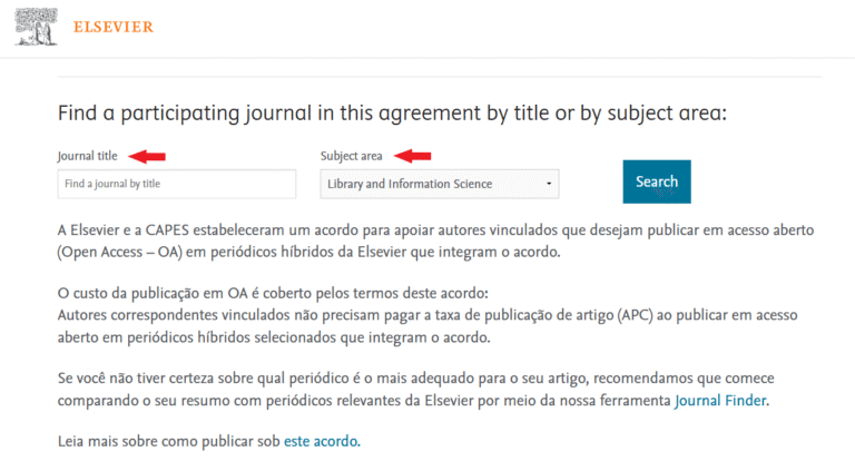 Clicar no ícone “Periódicos elegíveis“. Inserir o Título do Periódico (Journal) desejado ou a Área de interesse (subject area), para saber todos os periódicos contemplados naquela área do conhecimento, e clicar em “Search” (Figura 1).
