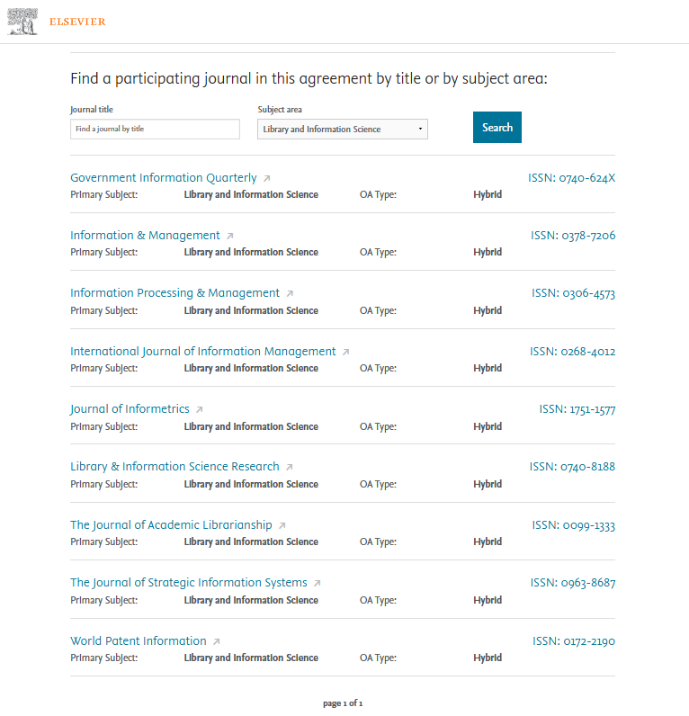Neste exemplo, em 20.01.26, usamos a Área de interesse (subject area) “Library an Information Science”, a qual recuperou 9 periódicos elegíveis, no formato de acesso aberto híbrido (Figura 2).