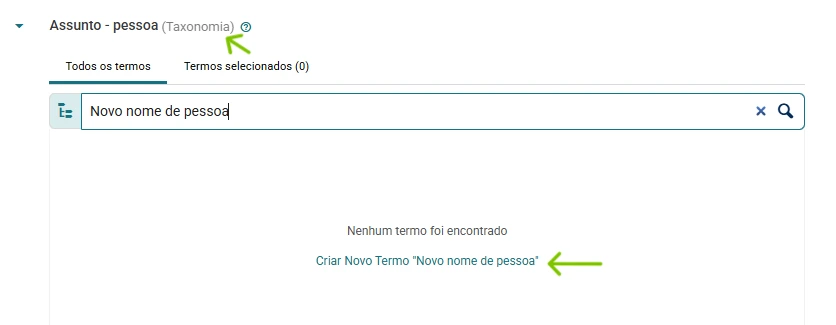 - Outras são abertas, como Assunto e Assunto – pessoa: nesses casos, o editor pode criar novos termos quando necessário (Figura 03).